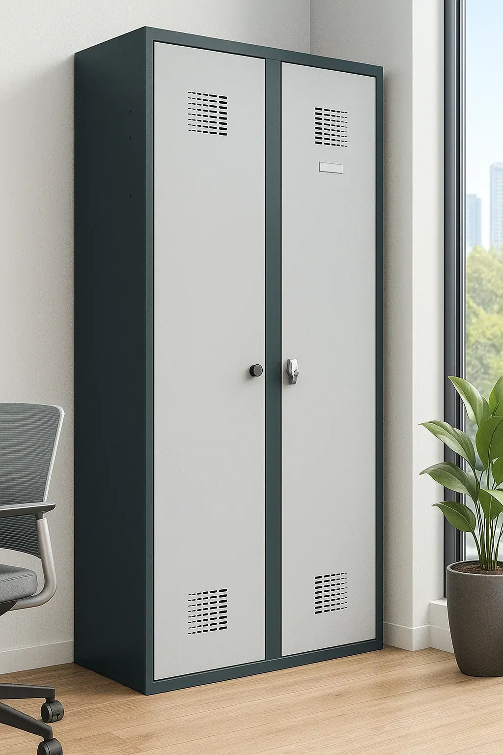 Unser vielseitiger Doppelspind aus Metall bietet eine robuste und funktionale Lösung für verschiedenste Einsatzbereiche. Mit Abmessungen von 60x50x180 cm oder 80x50x180 cm passt er sich flexibel Ihren Raumgegebenheiten an. Die pulverbeschichtete Stahlkonstruktion garantiert Langlebigkeit, während Features wie die Kleiderstange mit verschiebbaren Haken, integrierte Lüftungsöffnungen und abschließbare Türen praktischen Nutzen und Sicherheit vereinen.